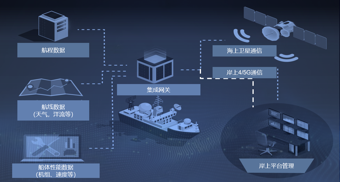 4、船舶管理核心业务数字化导航航线优化、设备状态采集、故障预警分析、大数据分析、油耗分析等。